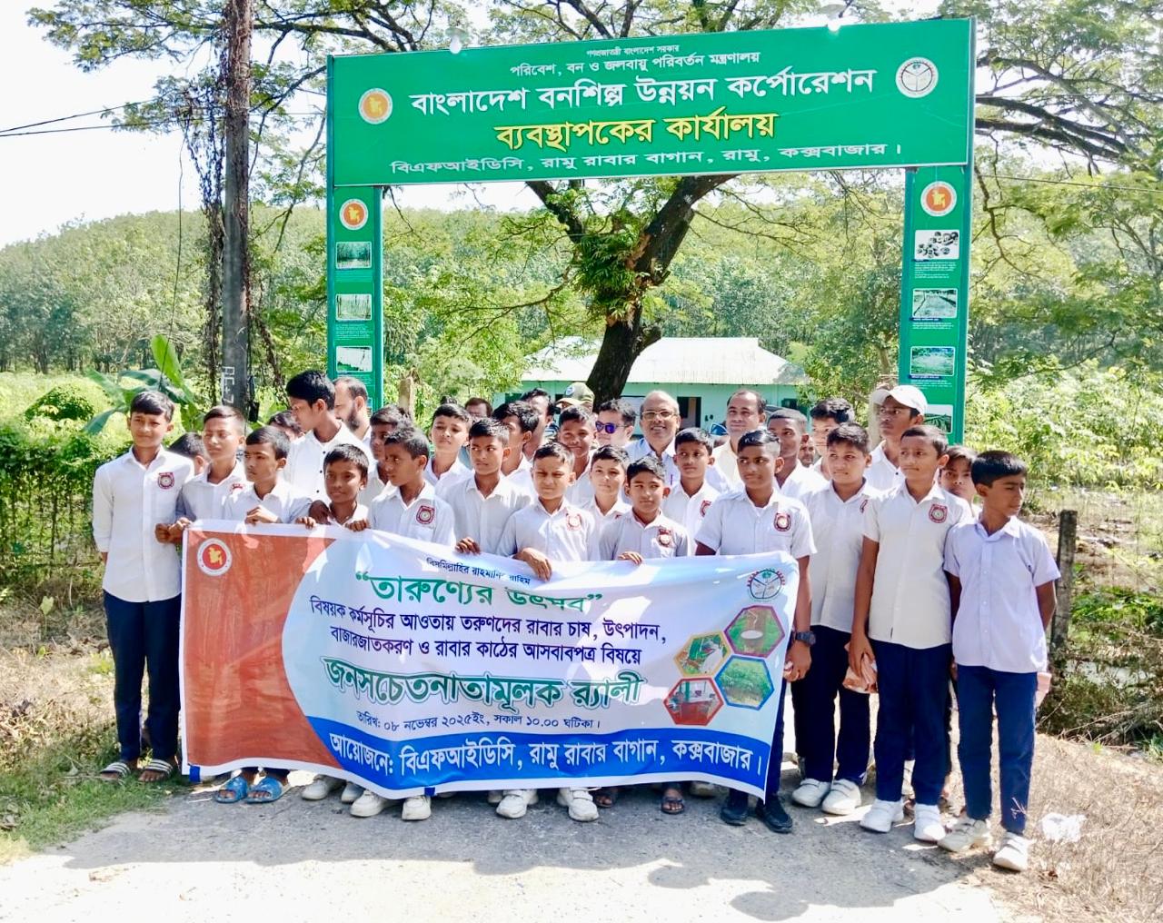 | তরুণদের রাবার চাষ, উৎপাদন, বাজারজাতকরণ, ও রাবার কাঠের আসবাবপত্র বিষয়ে জনসচেতনামূলক র্যালী আয়োজন। | বিএফআইডিসি, রামু রাবার বাগান, রামু, কক্সবাজারে কর্পোরেশনের চেয়ারম্যান মহোদয়ের নেতৃত্বে র্যালীর আয়োজন করা হয়।